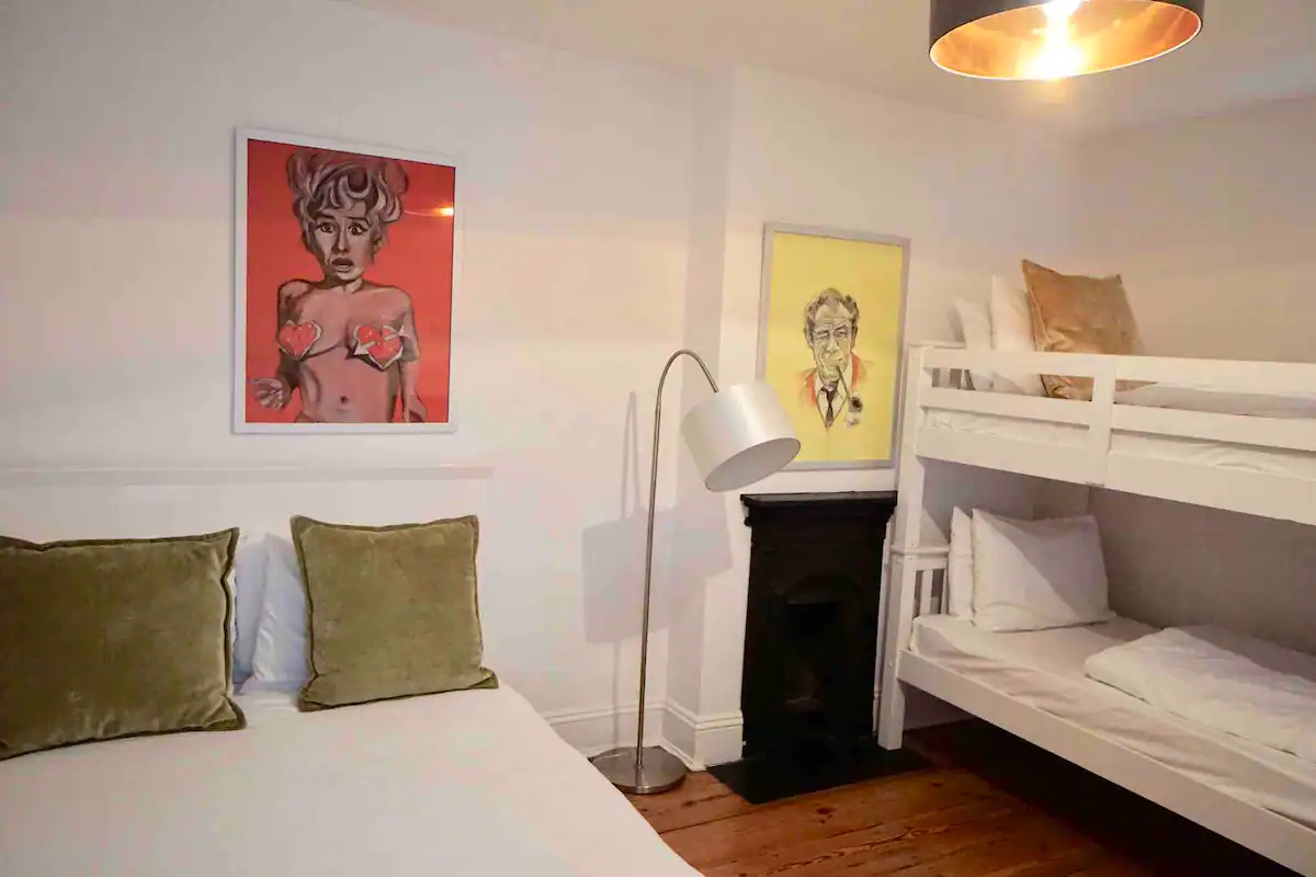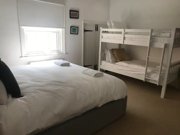 • Upstairs leads to a wide hallway with four crisp white bedrooms, all with original features, furnished & quirky artwork.