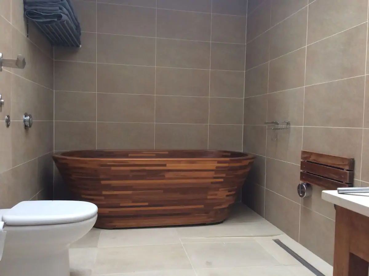 • The luxurious touch is the spacious and light decadent wet room with an extra-large teak bathtub and freestanding shower.