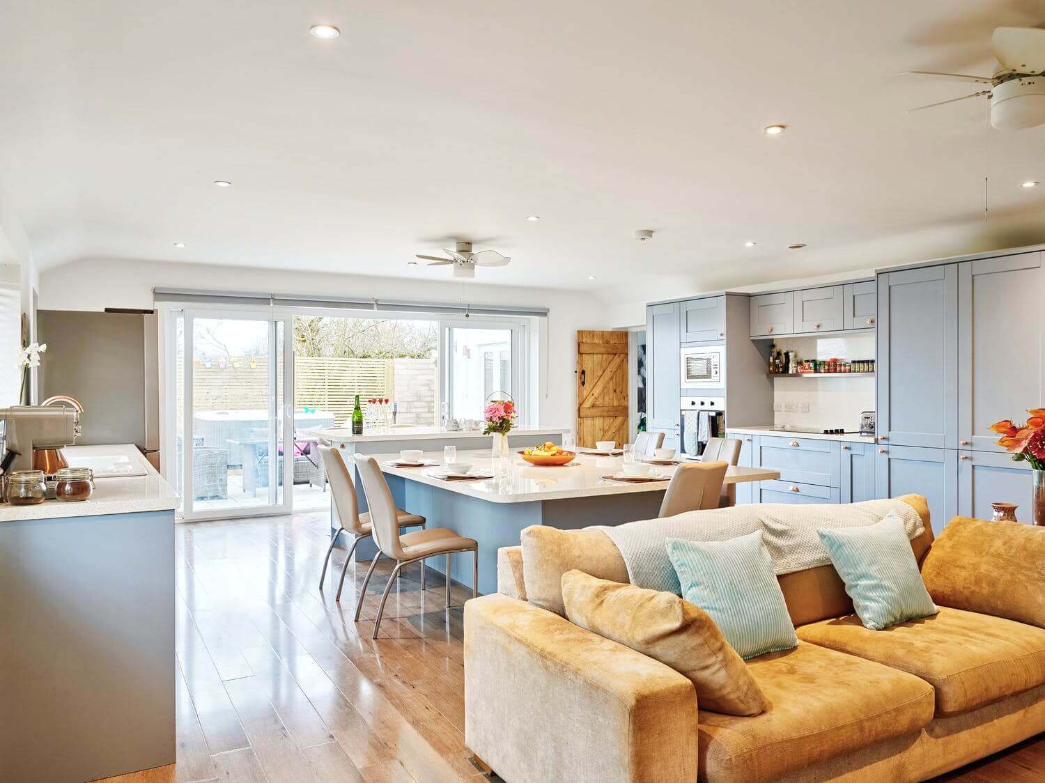 Inside, the Pineapple Bar comes with Playstation, pool table, bar and 49” TV. Hang out on the funky bean bags. Then head to the movie room with a 90” projector to dip into a full Sky menu. Tap into the BT wifi. Watch the 70” Sky TV as you rustle up your roast in the kitchen. Walk the dogs down the country lanes.